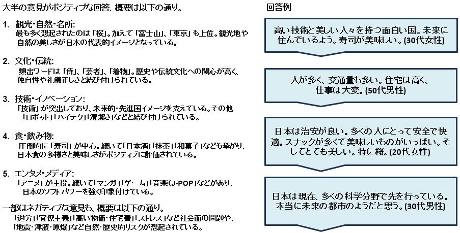■「桜」「アニメ」「技術」の3要素が圧倒的に多く、「自然美+文化的コンテンツ +先進技術」が日本イメージの核。