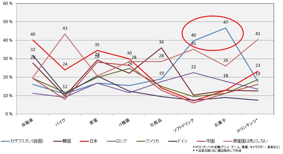 ■お菓子、ソフトドリンクは自国製支持が高い。
